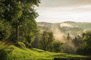 山间 晨光 草地 栅栏 С· 云雾 12k风景壁纸