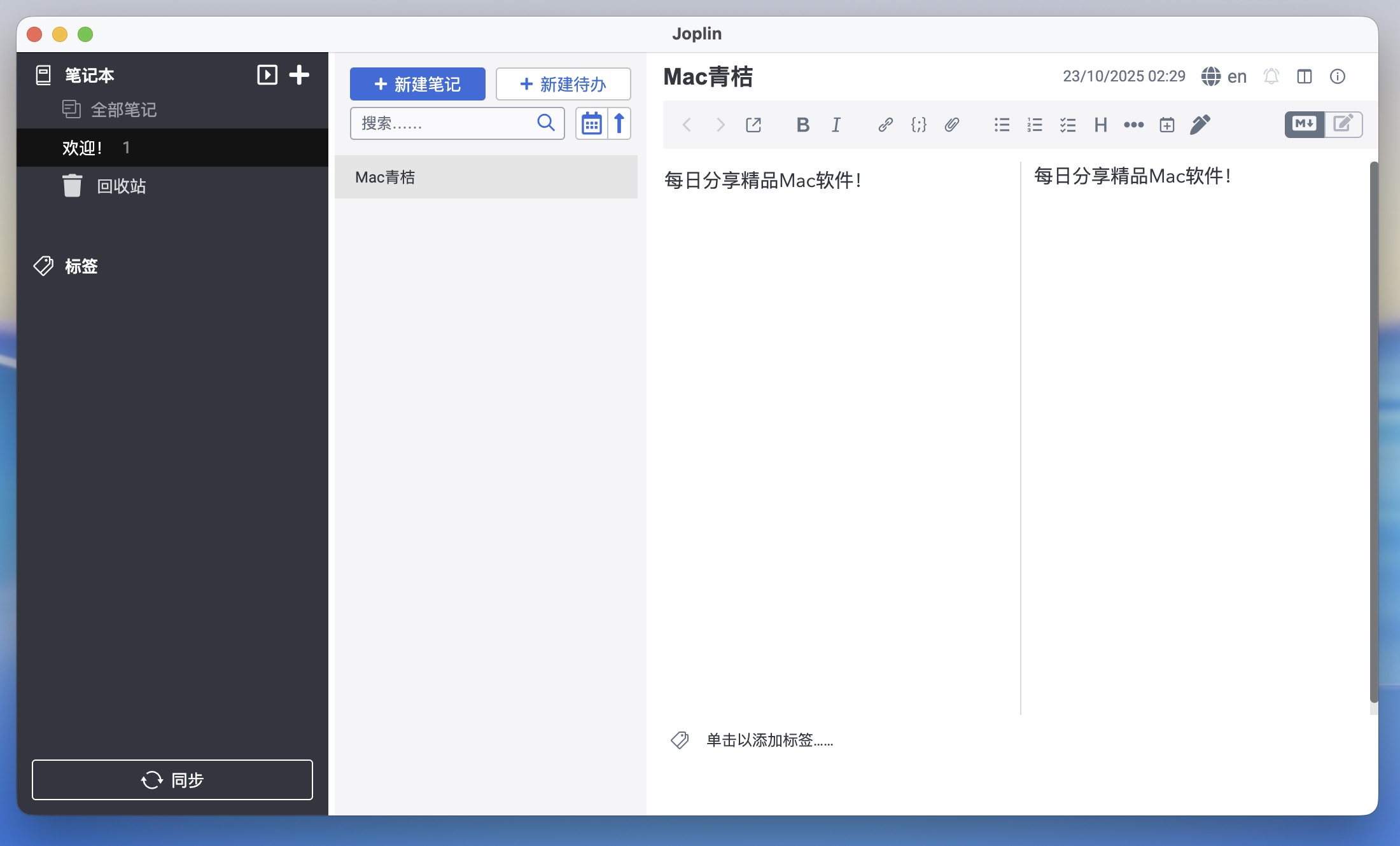 Joplin 是一款功能全面、灵活安全的 Mac 笔记和知识管理工具,无论是日常记录、工作整理还是学术研究,都能提供高效、稳定的支持。如果你正在寻找一款开源且跨平台的笔记管理软件,推荐前往 Mac青桔 搜索并下载 Joplin,平台安全可靠,并经过真机实测,为你的知识管理保驾护航。