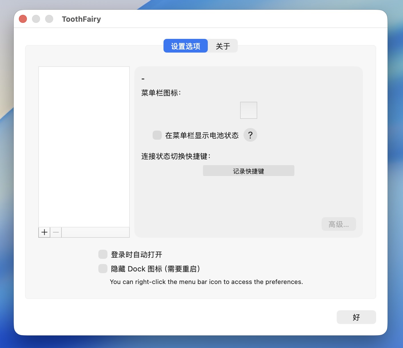 自动在登录时启动:设置后 ToothFairy 可在 Mac 登录时自动启动,始终保持在菜单栏备用状态。