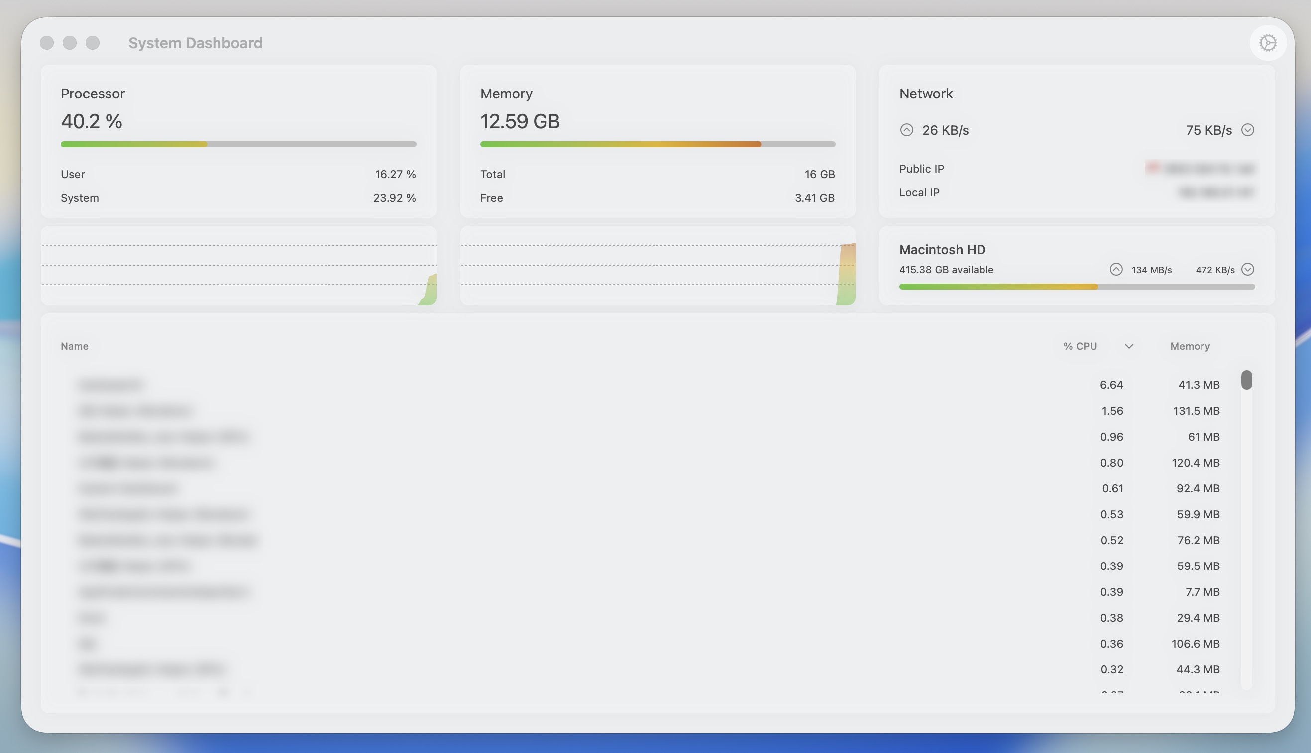 System Dashboard 是一款全面的系统监控工具,旨在提供用户实时监控计算机性能和系统状态的能力。通过直观的界面和丰富的数据可视化,用户可以轻松获取 CPU、内存、硬盘和网络等各项系统指标的信息。无论是个人用户还是IT专业人员,System Dashboard 都能帮助用户更好地理解和优化系统性能。