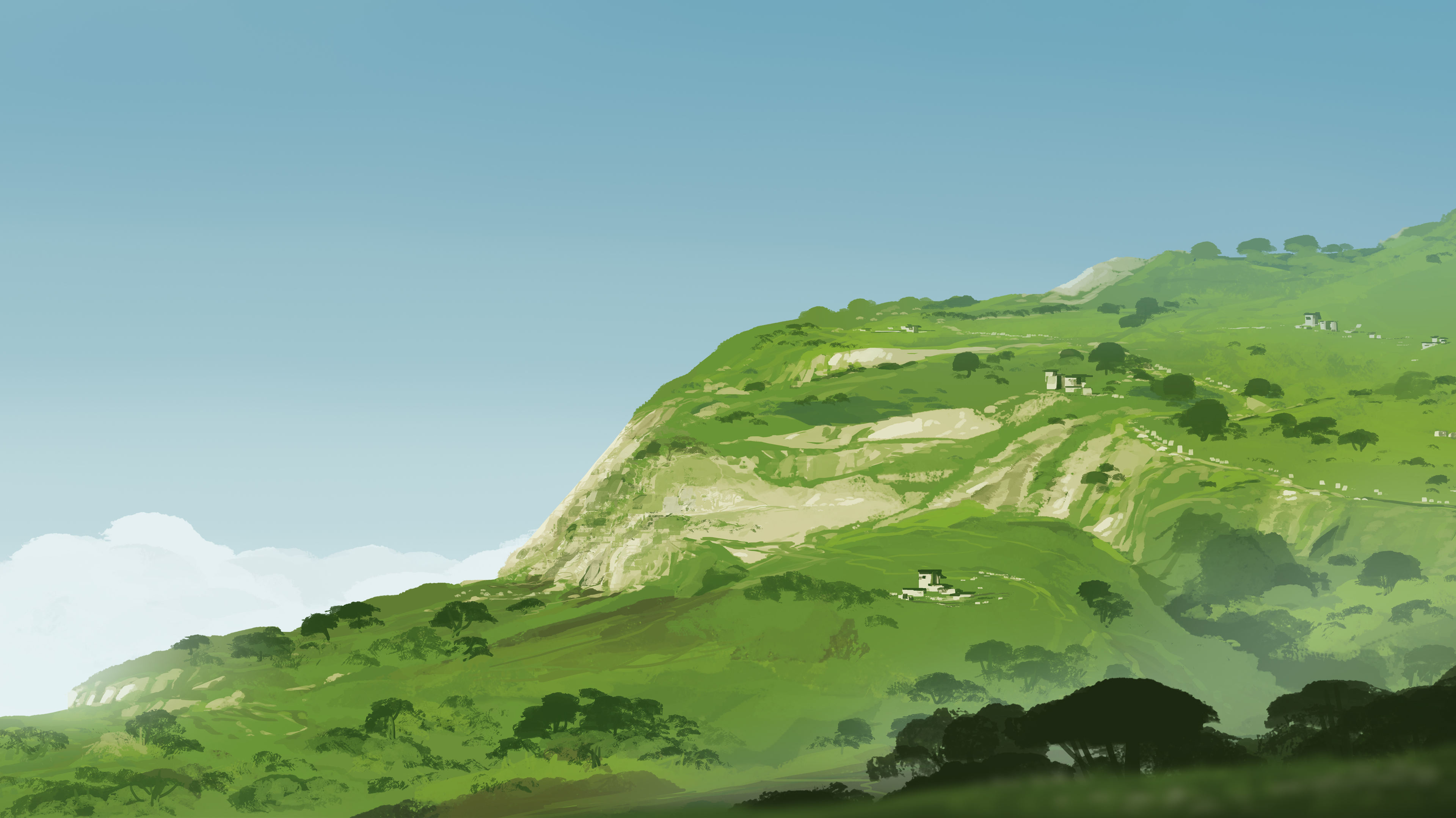 超宽 宽屏 插图 数字 绘画 风景 房屋 山脉 自然 树木 天空 绿色 云 4K壁纸