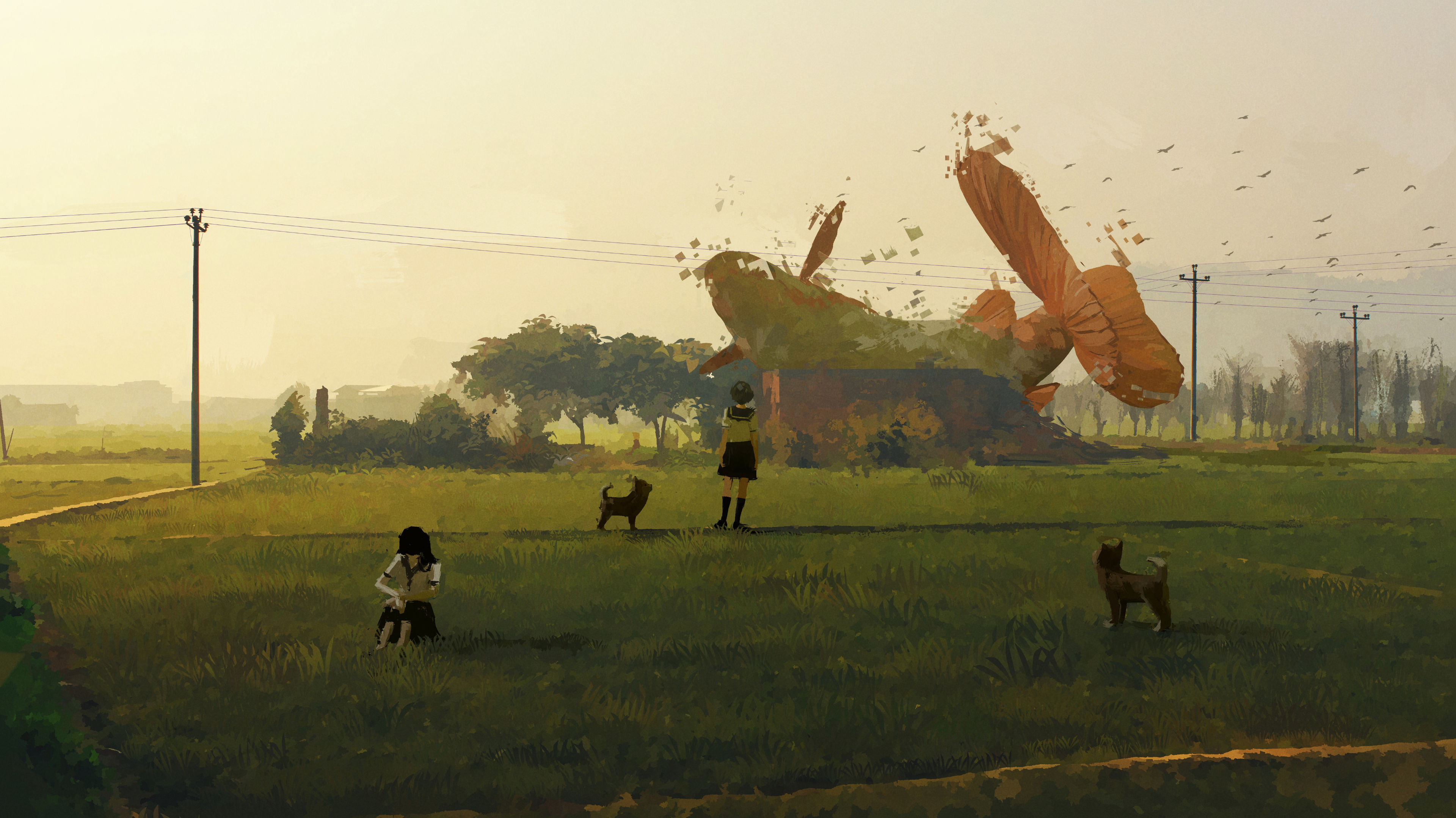 女学生 插图 风景 电线 狗 田野 幻想 艺术 树草 4K壁纸