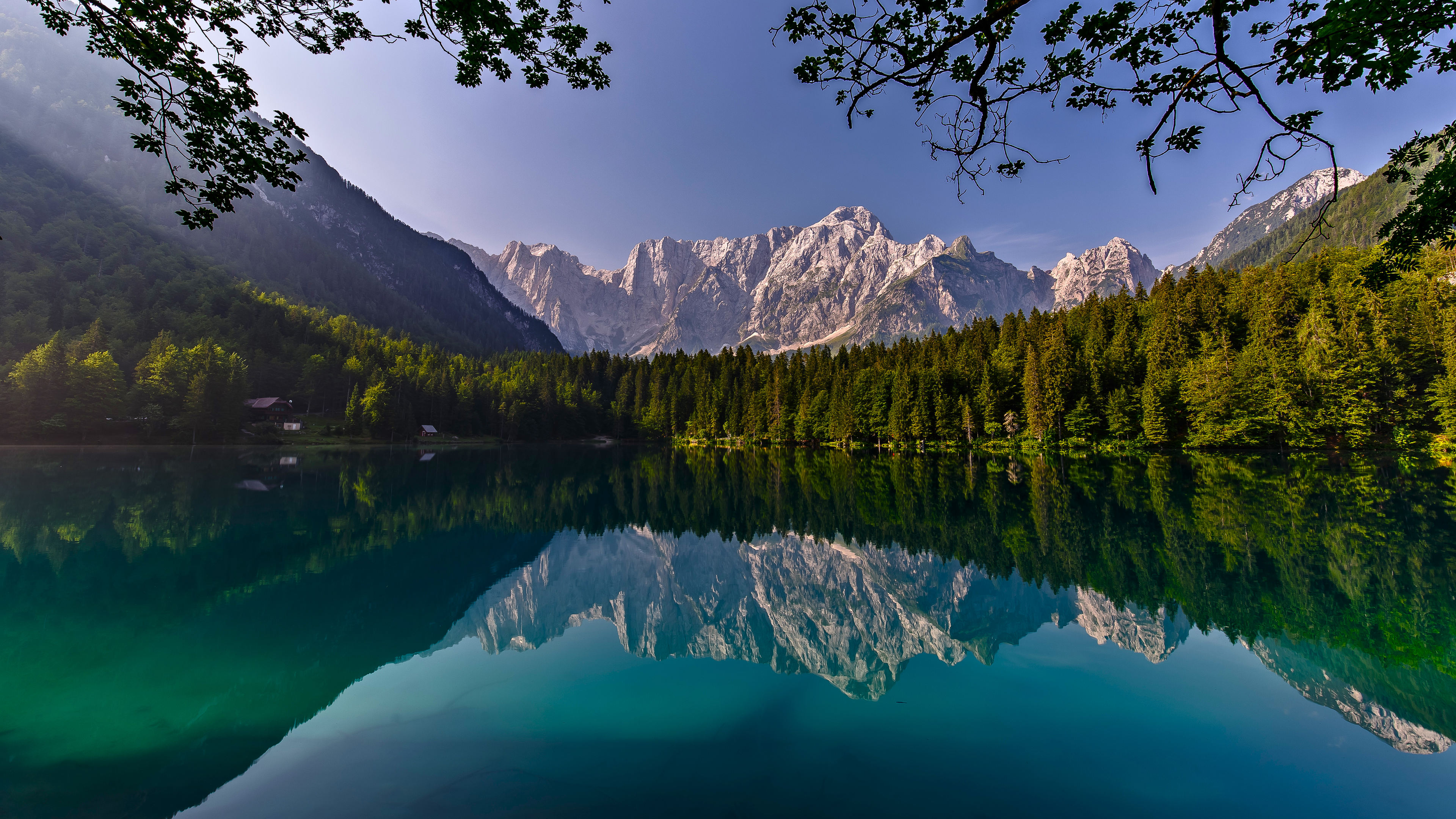 自然 景观 树木 森林 水 倒影 晴朗 天空 湖泊 山脉 房屋 阳光 天空 树枝 4K壁纸