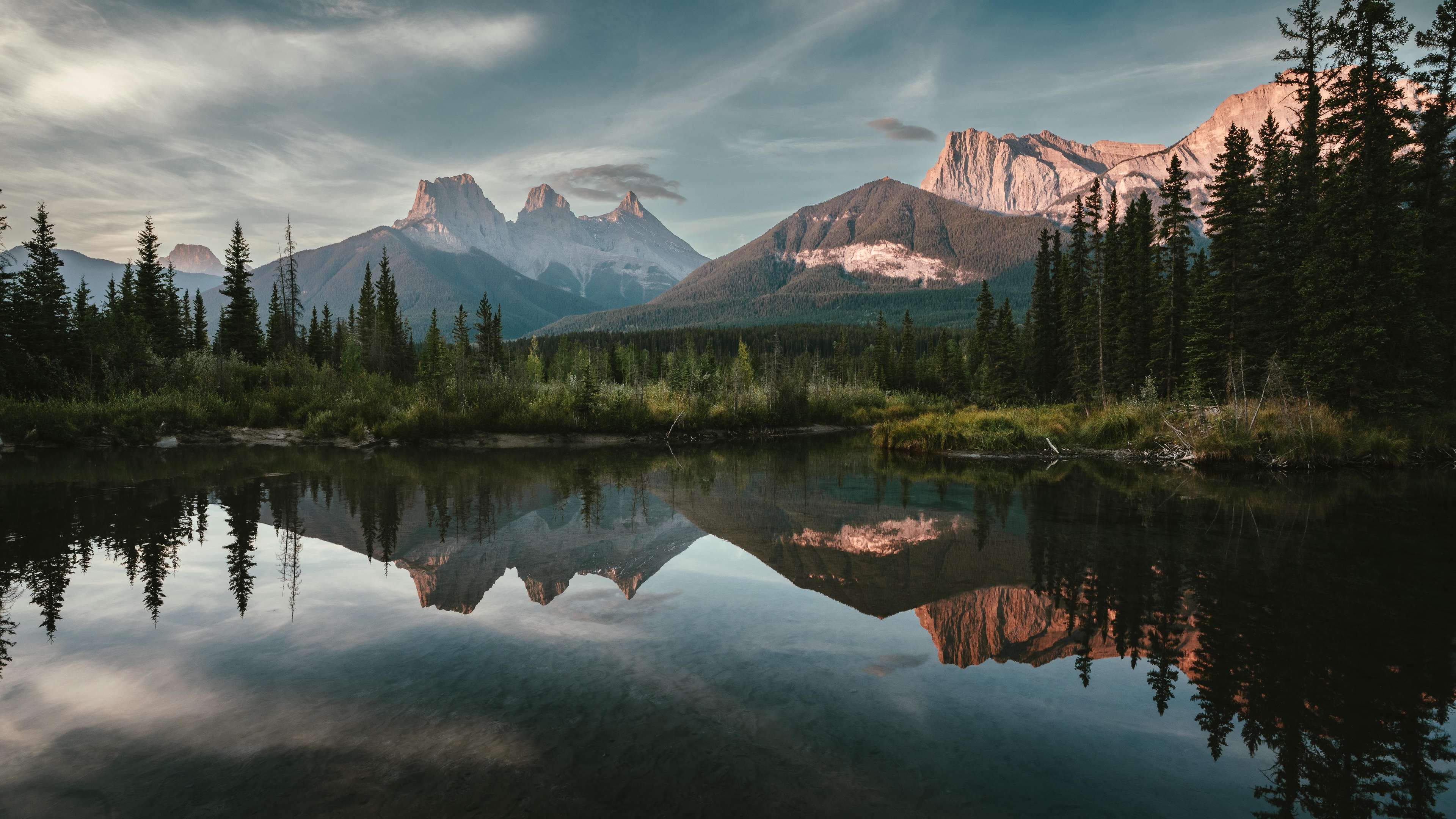 湖泊 悬崖 日落 自然 景观 森林 倒影 山脉 云 水 树木 天空 4K壁纸