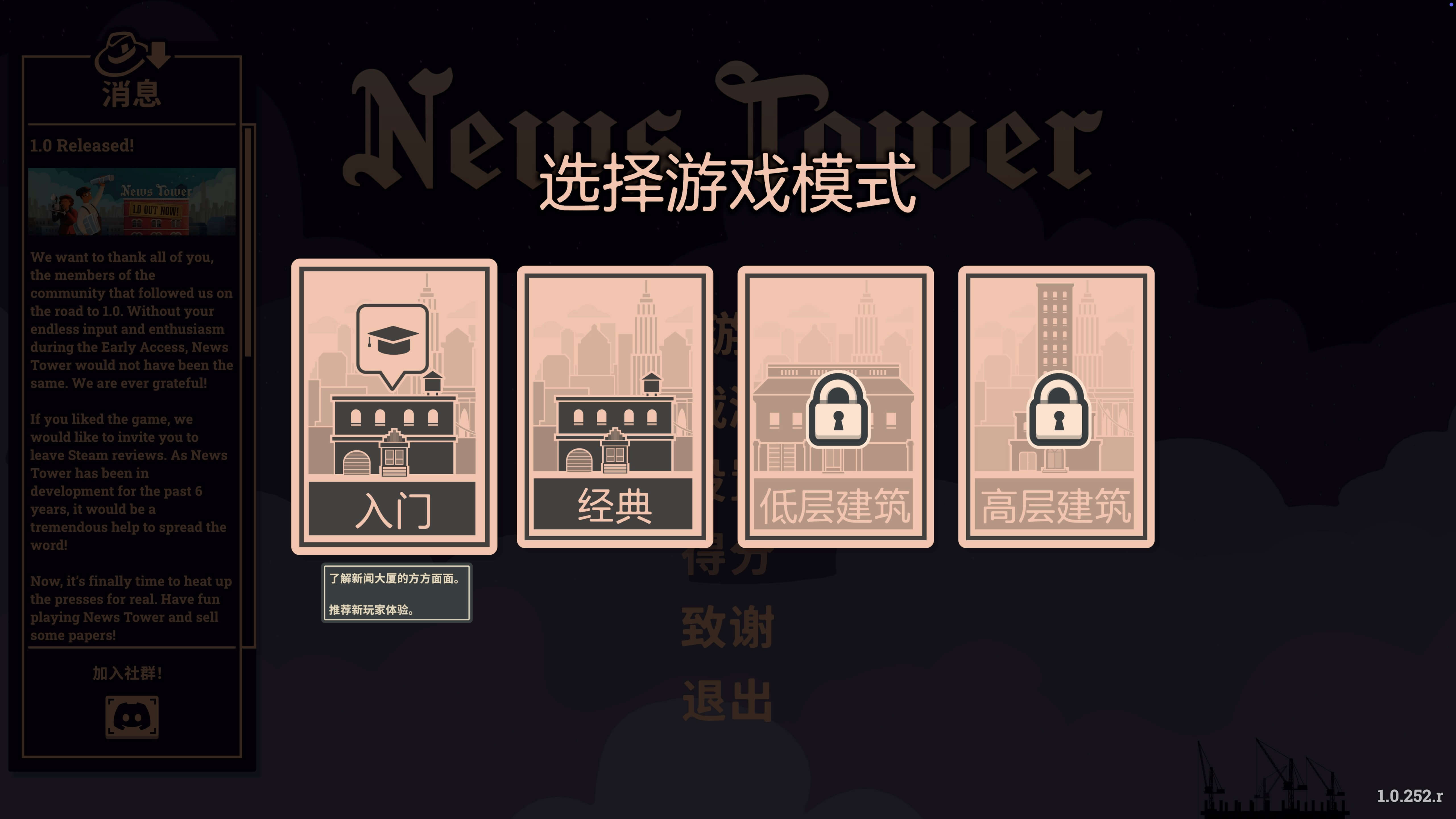 《新闻大厦》(News Tower)是一款以新闻业为核心的模拟经营游戏。玩家将在1930年代的美国大萧条时期,亲自打造并管理一家新闻媒体帝国。从创办小报到逐步扩展为全国知名的媒体集团,你需要在纸张供应、广告收入、新闻采编与社会压力之间找到平衡,让报纸既能生存下去,又能在舆论场中产生影响力。