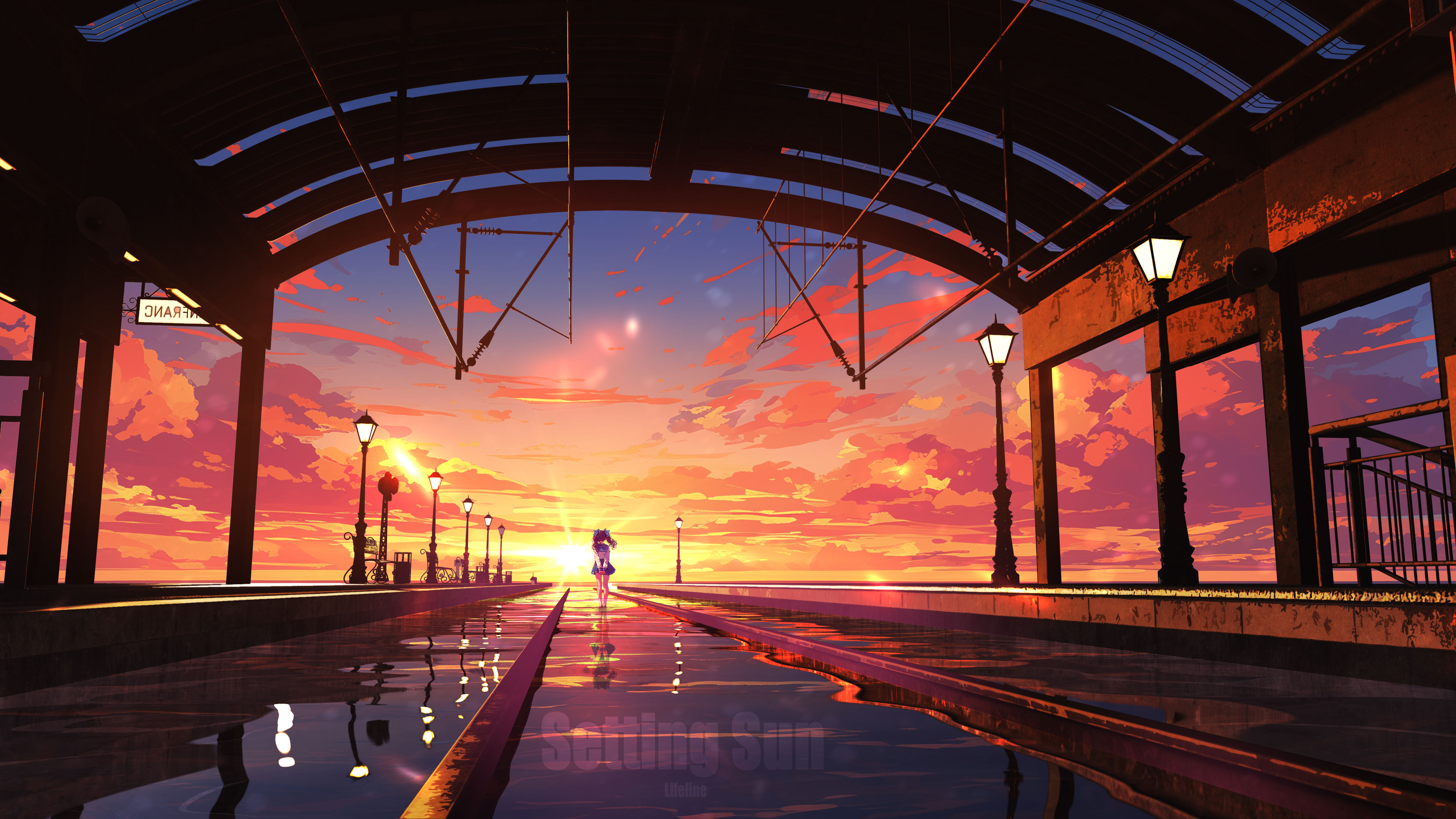 站立 动漫 女孩 黑裙子 灯柱 晚上 栏杆 倒影 风景 衬衫 楼梯 火车站 白衬衫 水 4K壁纸