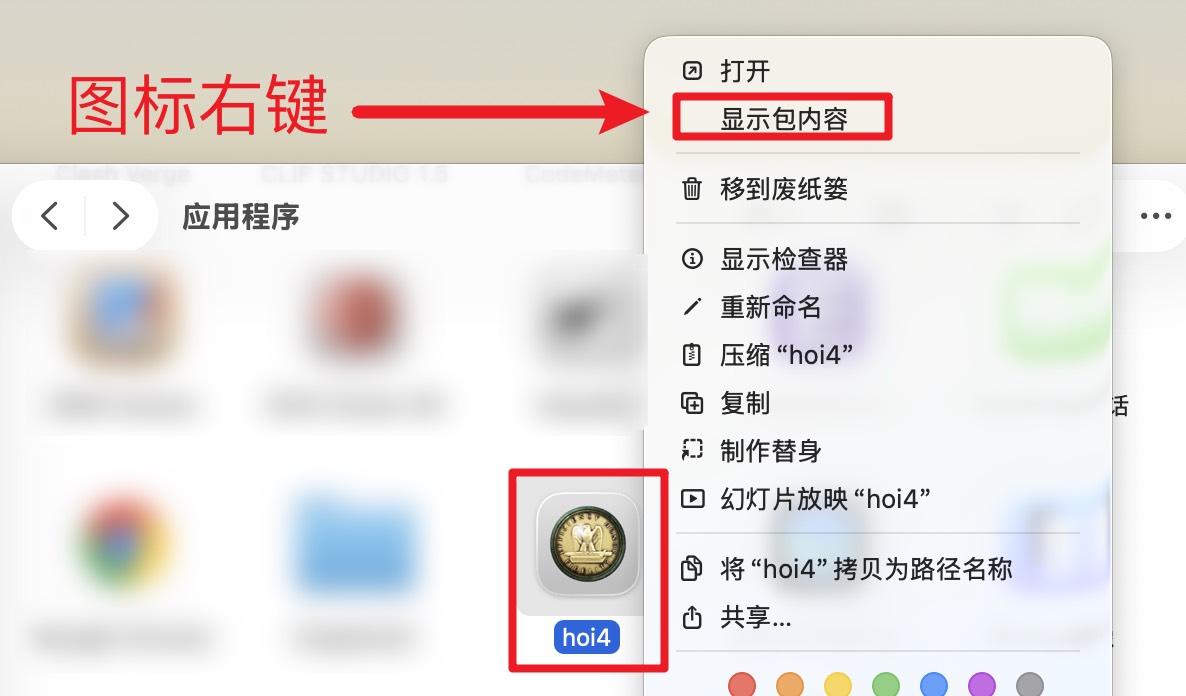 1.将左侧 hoi4 拖动到右侧应用程序文件夹中完成游戏安装