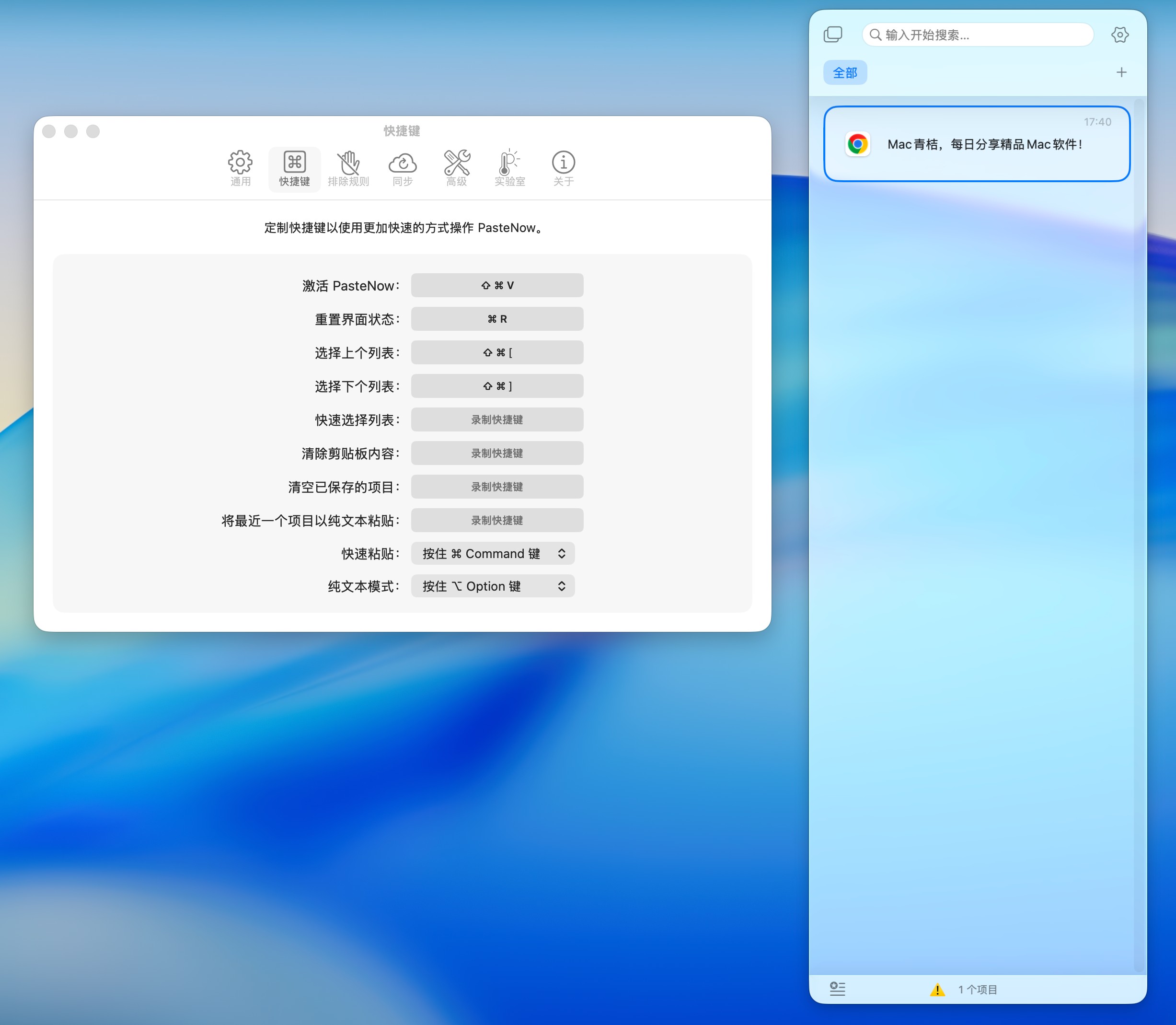 在实际使用中,PasteNow 的体验非常流畅。通过快捷键即可在任意界面快速唤出剪贴板历史列表,复制过的内容几乎即时同步显示,不会出现延迟或遗漏。界面设计简洁克制,内容分类清晰,查找历史剪贴板信息时思路非常顺畅。无论是通过键盘快速定位,还是使用鼠标浏览、拖拽粘贴,都符合 macOS 用户的直觉操作习惯。后台运行稳定、资源占用低,即便长时间开启也不会对系统性能造成明显影响,非常适合作为常驻型效率工具使用。