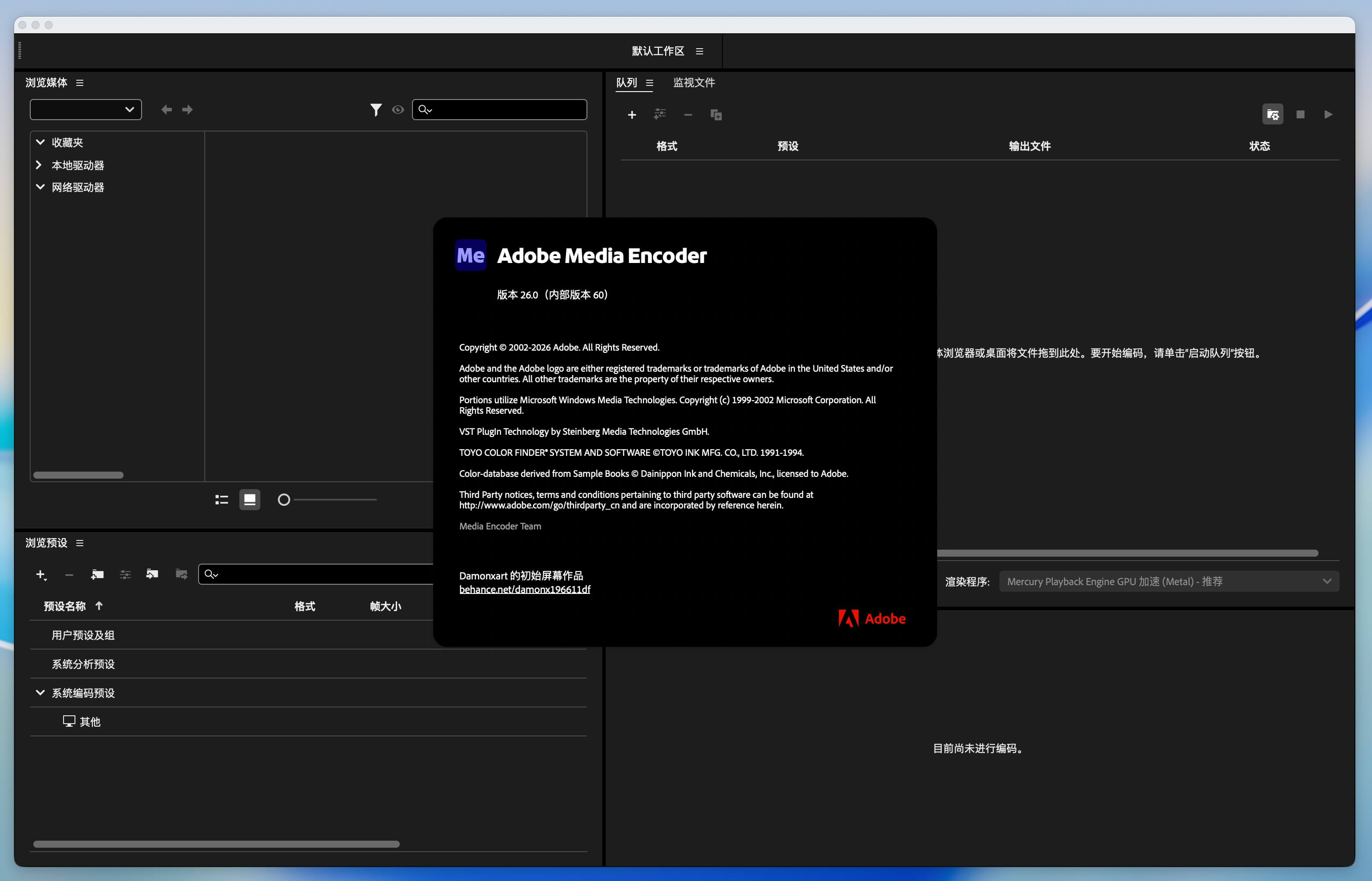 Adobe Media Encoder 2026 是 Adobe 公司推出的专业级媒体转码与输出处理软件最新 Mac 版本,专为视频制作人员、后期编辑师、内容创作者等人群打造。在 macOS 平台上,Media Encoder 2026 深度整合 Apple Silicon(如 M 系列芯片)和系统底层功能,使媒体编码与批量渲染过程更加高效稳定。作为 Adobe Creative Cloud 中音视频工作流的重要组成部分,它常与 Premiere Pro、After Effects 等软件联动,用于将项目输出为适合不同平台和格式的最终文件。新版界面延续简洁专业风格,支持丰富编码器选项与预设管理,在 Mac 上兼顾性能与易用性,是处理多格式、多场景输出任务的关键工具。