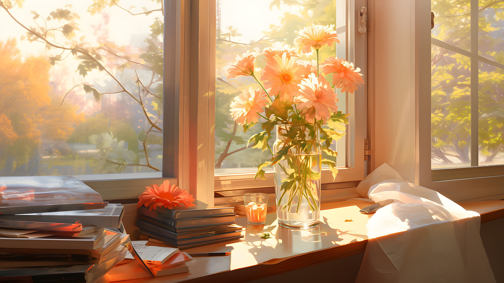 阳光 花园 书籍 鲜花 窗台 艺术