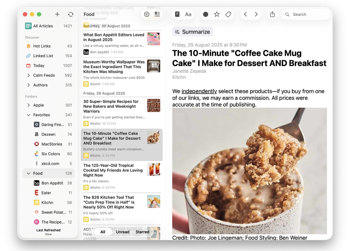 在 macOS 上使用 Lire 的体验非常流畅自然。软件界面遵循 Mac 设计风格,支持深色模式与多种阅读布局,长时间阅读也不会感到疲劳。用户可以通过左侧栏快速切换不同订阅源或分类,中间区域显示文章列表,右侧则为阅读内容区,整体结构清晰。Lire 支持手势操作和快捷键,使浏览与切换更加高效。同时,软件提供全文抓取功能,即使原始网站仅提供摘要,也可以直接在应用内查看完整内容。对于喜欢专注阅读、不希望被广告或弹窗干扰的用户来说,这种集中式阅读方式非常舒适。
