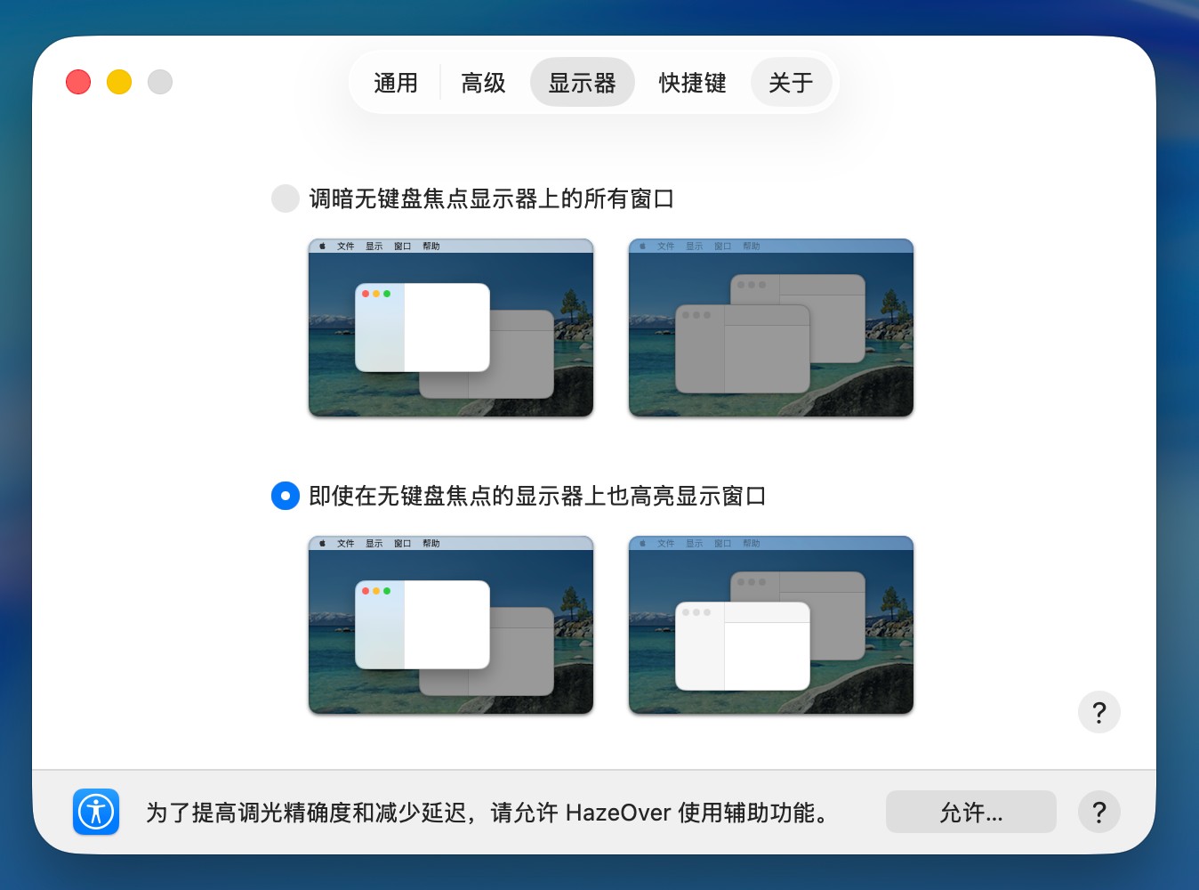 在 macOS 上使用 HazeOver 的体验可以用“无感但有效”来形容。开启后,当前窗口始终保持清晰,而其他窗口会自动变暗,切换应用时这种效果会平滑过渡。整个过程几乎不需要用户干预,却能明显减少注意力分散。特别是在多窗口并行(例如写文档+查资料+聊天工具)时,背景信息不再频繁干扰视线,让工作节奏更加稳定。软件支持快捷键快速开关,也可以调整暗化强度,从轻微提示到强专注模式都能覆盖,整体体验自然且不突兀。