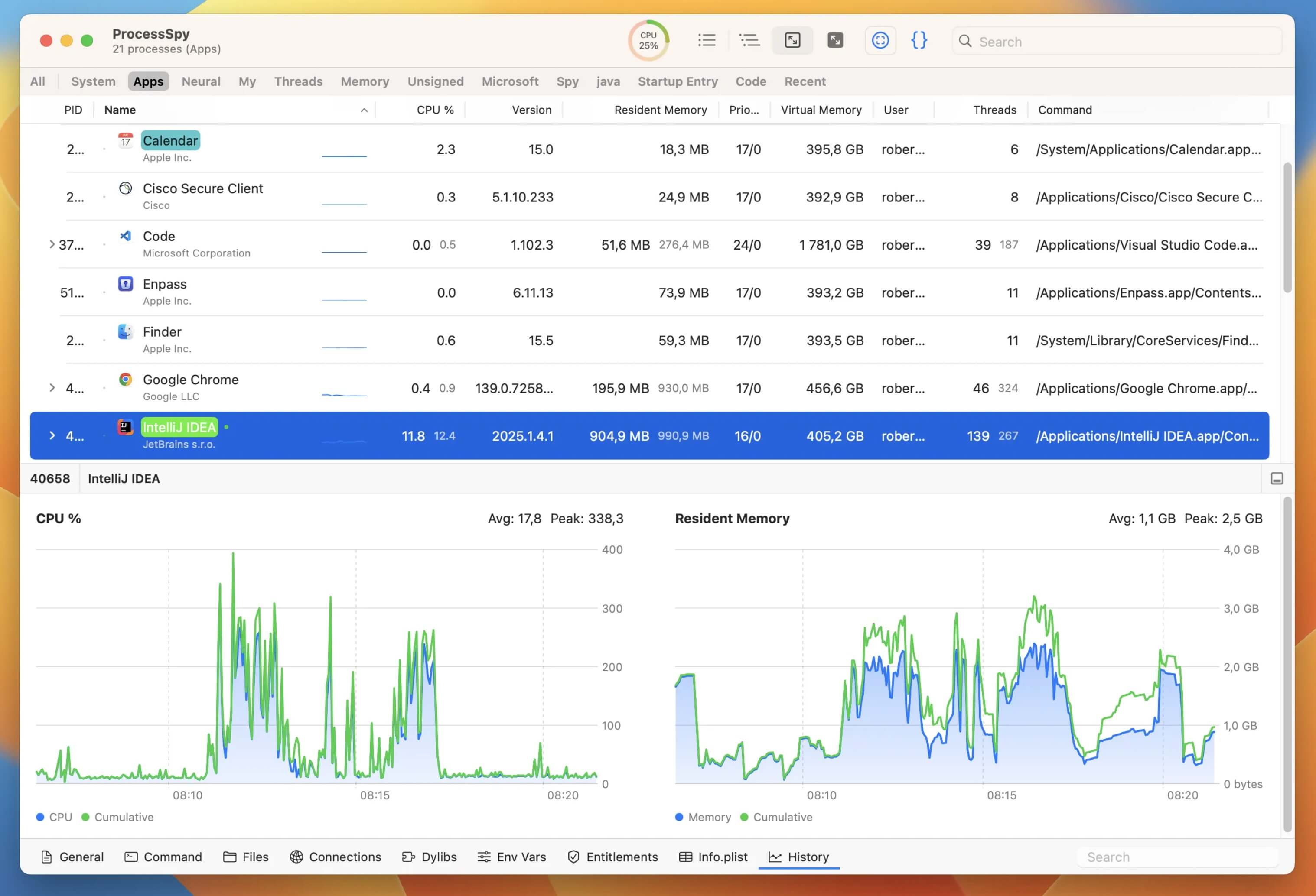 在 macOS 上使用 ProcessSpy 的体验偏向专业但不复杂。打开软件后,用户可以看到当前系统中所有进程的详细列表,包括 CPU、内存、磁盘等资源占用情况。界面布局清晰,支持排序与筛选,方便快速定位问题进程。在实际使用中,例如系统变卡或风扇狂转时,用户可以通过 ProcessSpy 快速找出占用资源异常的程序。软件运行稳定,刷新数据及时,占用资源较低,适合作为日常监控工具常驻使用。