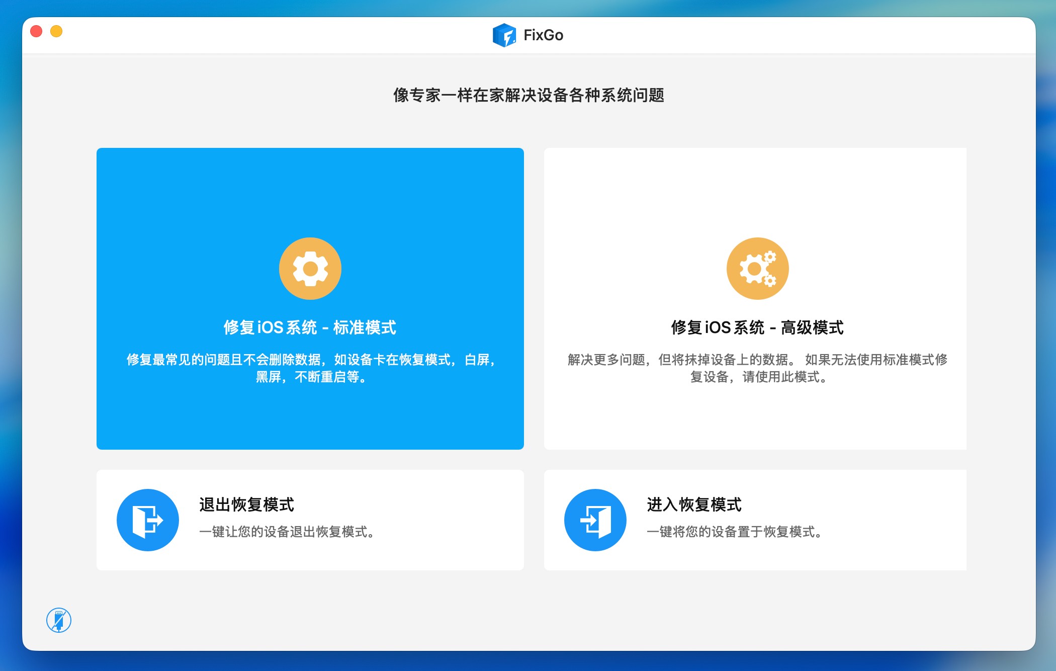 在 macOS 上使用 iToolab FixGo 的体验相对简单直观。软件提供清晰的引导流程,用户只需连接设备并按照提示操作,即可开始修复过程。界面将“标准模式”和“深度修复”区分明确,方便用户根据问题选择合适方案。在实际使用中,整个流程自动化程度较高,无需技术背景也能顺利完成。软件运行稳定,适合在设备出现系统异常时作为应急工具使用。