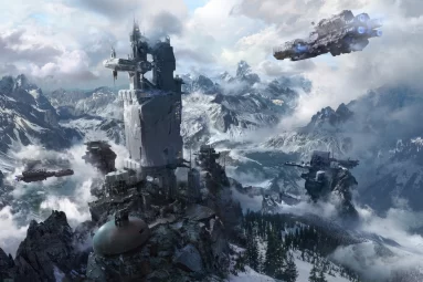 雪地 云 雾 飞舰 基地 12k动漫风景壁纸